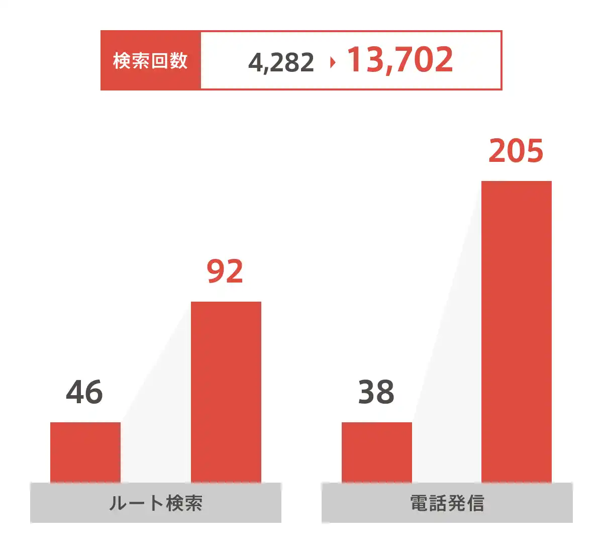 マップ上での検索回数は約3.2倍となり これまでほとんどなかったルート検索も2倍まで伸び、電話発信数5.4倍となり予約件数も伸長。売り上げも30%増に
