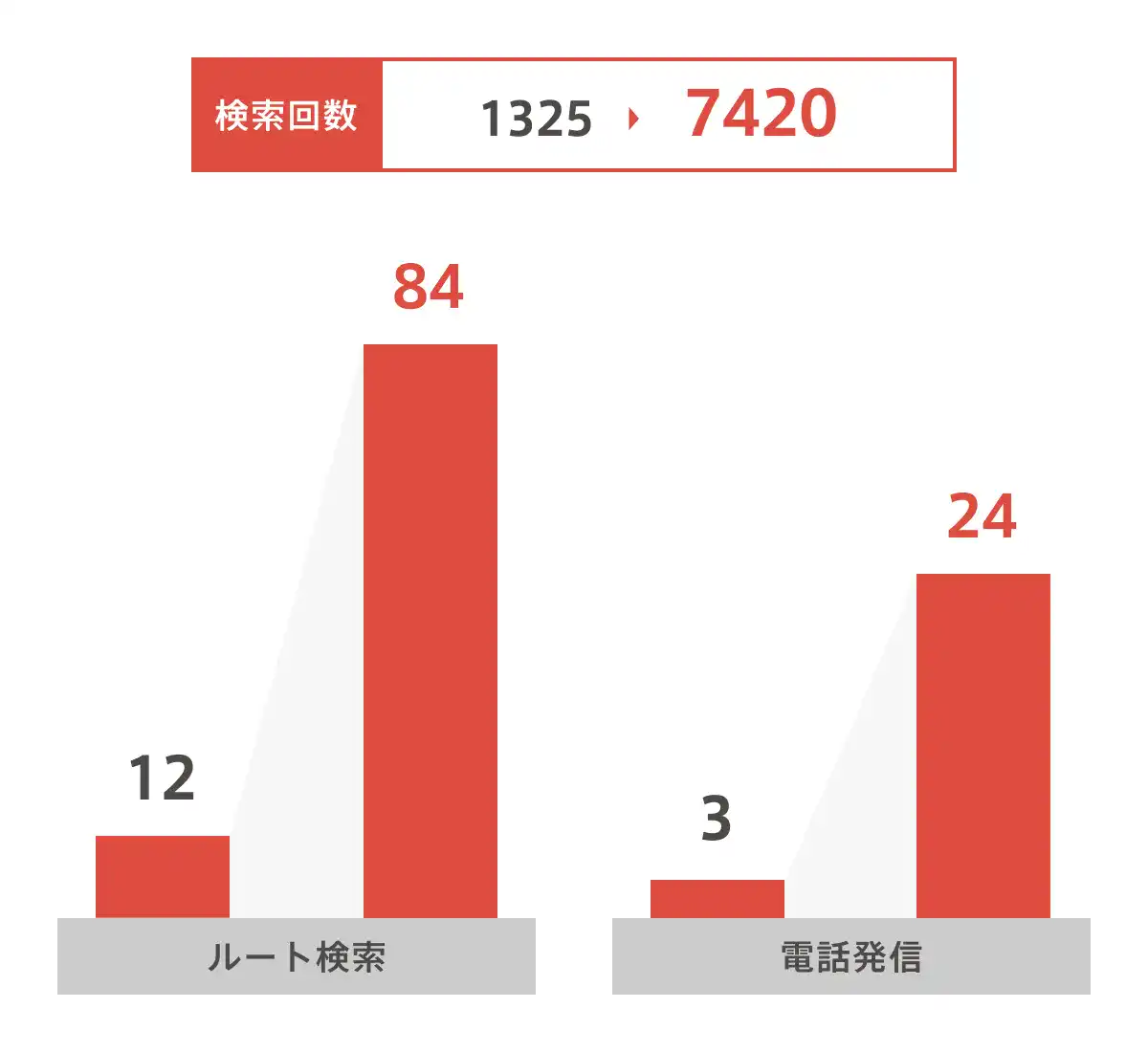 検索回数は約5.6倍に増加。ルート検索7倍、電話発信数も8倍まで増加。新規キーワード調査にて新規ユーザーの囲い込みに成功。月売上100万アップ